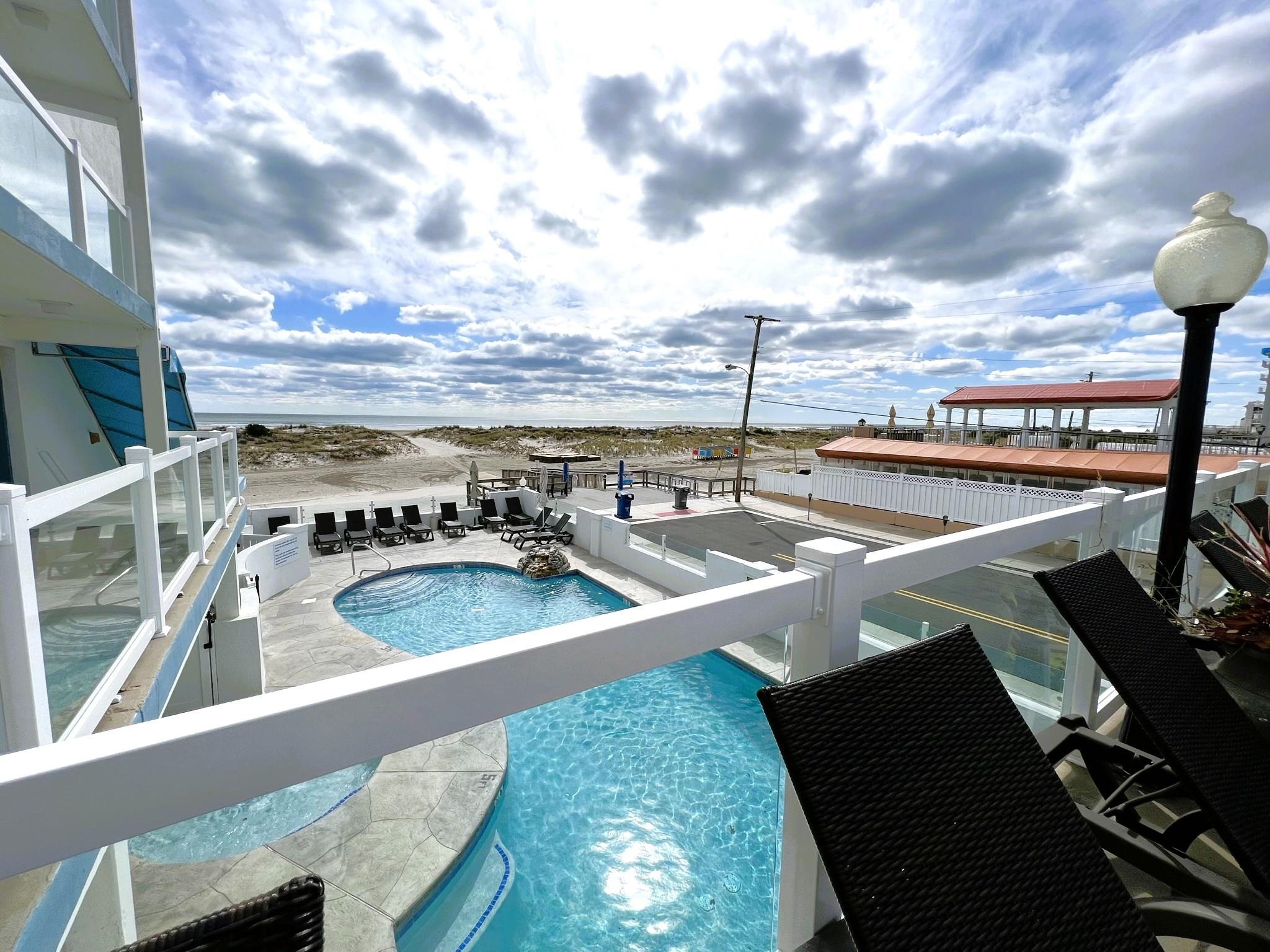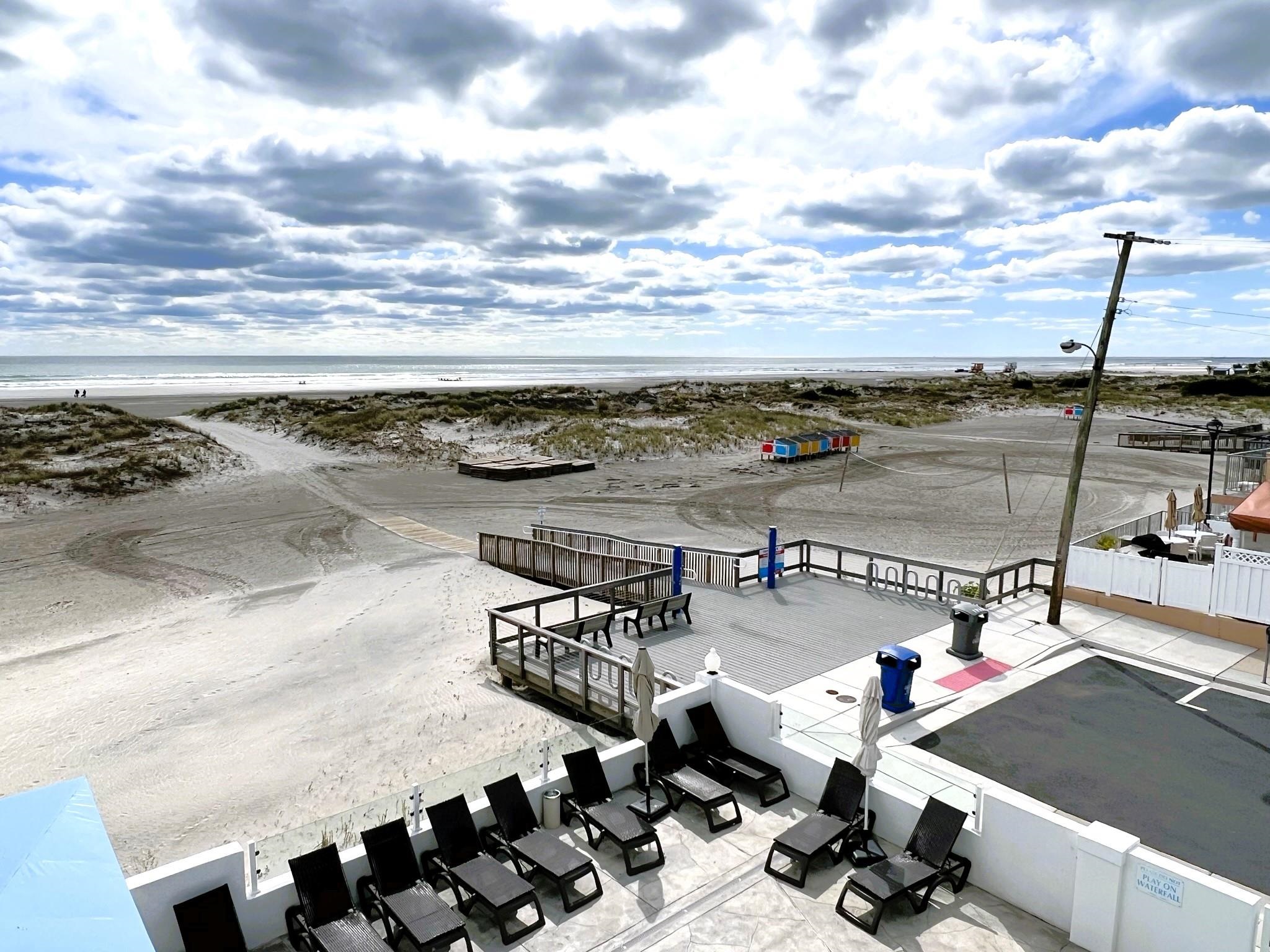 THIS UNIT HAS A DIRECT VIEW OF THE BEACH WITH PRIVATE BALCONY!! Welcome to the Beau Rivage Condominiums located DIRECTLY ON THE BEACH in the southern end of beautiful Wildwood Crest NJ. The unit is equipped with central air and heat and can be utilized year-round. The tiled living space offers a sleep sofa for additional guests, dining area, kitchen and bath. The generous sized bedroom currently has a King bed, but it can accommodate two doubles. The bedroom also has custom built armoire, nightstand, and dresser. BEING SOLD FURNISHED, INCLUDING TVs. Complex amenities include an elevator, heated swimming pool and kiddie pool, gas BBQ grills, 2 second floor sundecks (one with fixed pavilion seating), off-street parking, storage for beach gear and an enclosed bike rack area. In season, you can enjoy breakfast or lunch at Lemma’s Beach Grill that’s conveniently located on the ground level beachfront. There will be on-site rental management for those who wish to utilize it. The beach access has new bulkhead, sitting area and showers to rinse off the sand. HOA fee includes ALL UTILITIES: water, sewer, electric, gas, exterior insurances, Wi-Fi (Comcast) and Direct TV (cable). The interior of the units and exterior of the complex have had some recent updates, including a new pool area and glass railings.