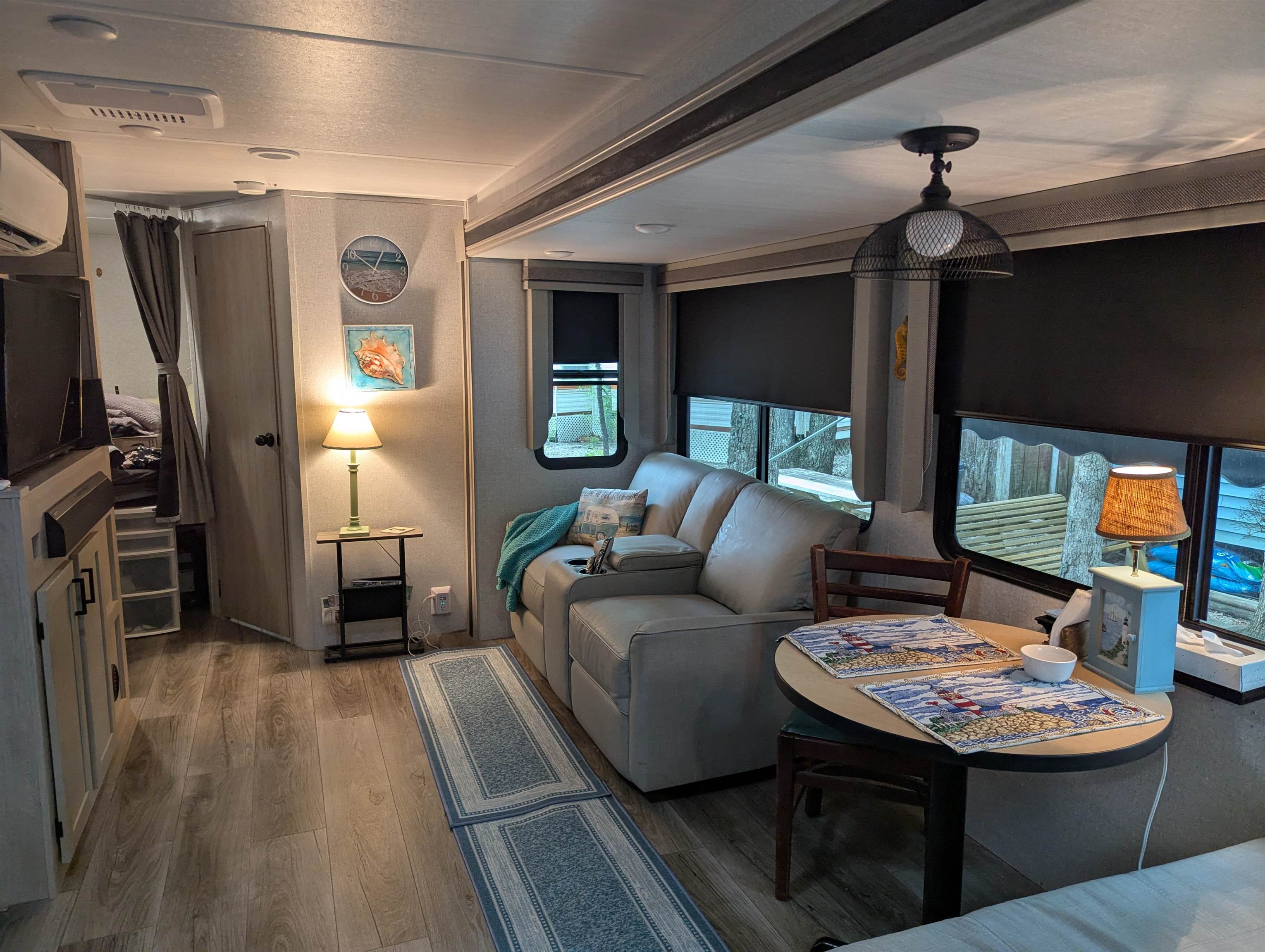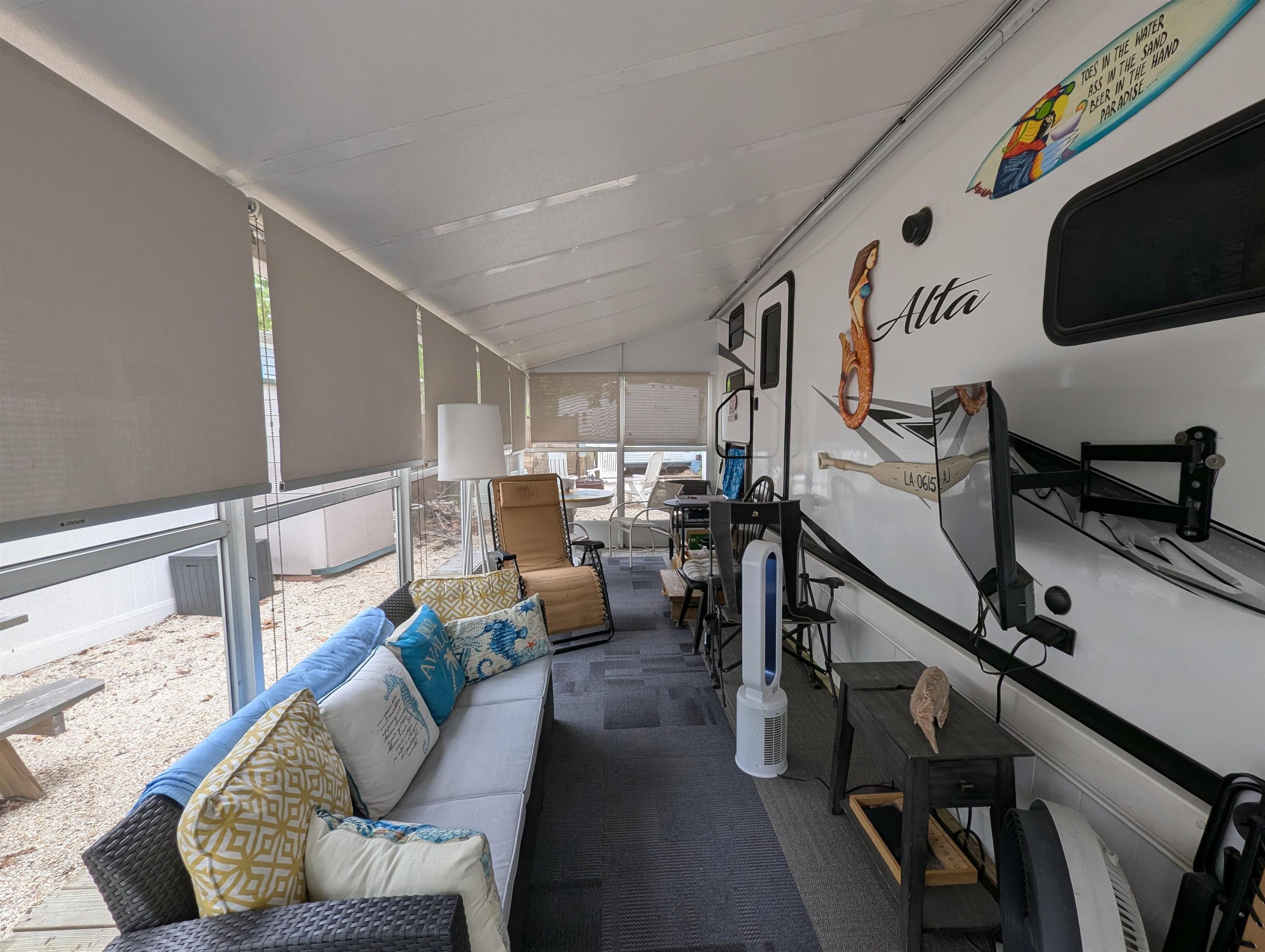 Lovely 2022 Alta travel trailer. This unit has been lovingly maintained thru-out. This unit has an open interior with a bunk room, brand new motorized love seat, dining area with a bench seat, lots of storage, ss refrigerator, like new range, overhead microwave oven and ss sink. Bathroom has a new comfort height toilet with bidet, walk in shower, new faucet and ample storage. The primary bedroom has built ins and a new NY bedding RV king size mattress. Brand new mini split does heat and air, large TV and sound system all included. Venture outside to your almost new 8x24 screened in porch addition with TV. Newly stoned exterior, new vinyl fence and temporary privacy fence, fire pit and large shed. Basically, maintenance free exterior. And the golf cart is included. This unit is located on the perfect lot with views of the lake. Lot rent is included for the 2025 season ($6300)