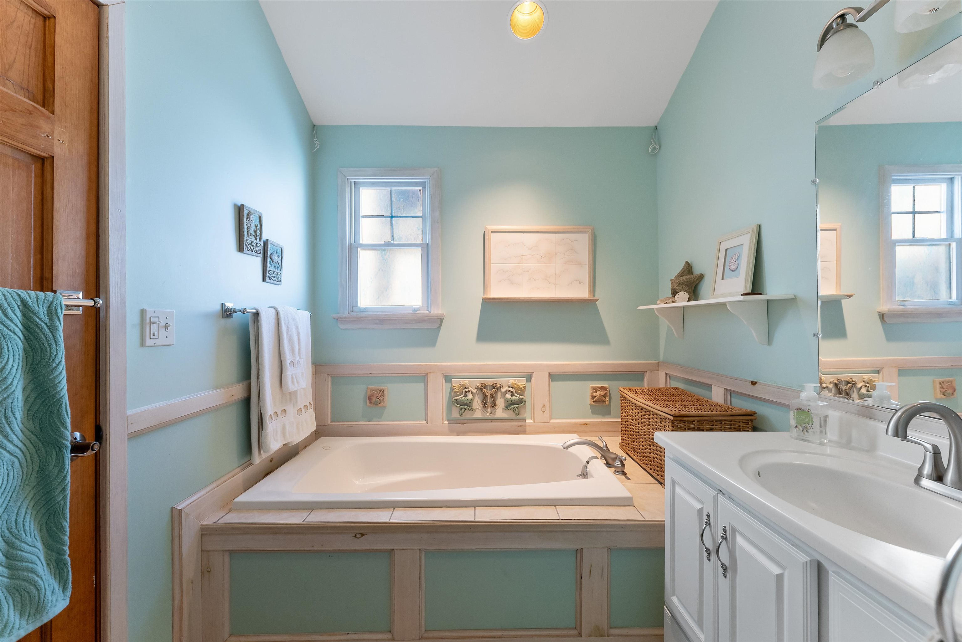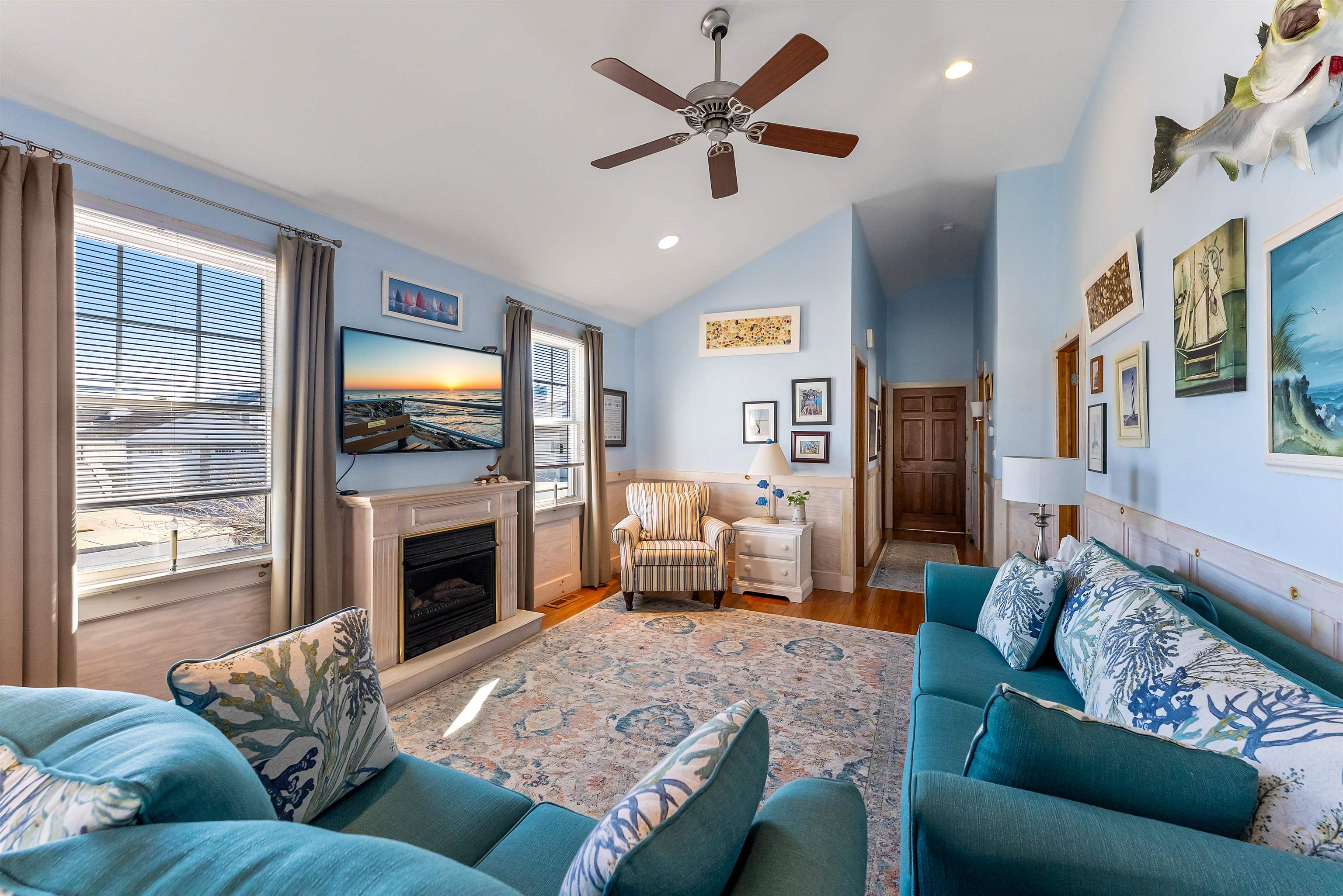 Experience coastal LUXURY at its finest in this STUNNING 4-bedroom, 2.5-bath, home ideally LOCATED just moments from the Bay, popular restaurants, and everything that makes shore living unforgettable. At the heart of the home is a SHOW-STOPPING chef s kitchen showcasing a BEAUTIFUL tile backsplash, LARGE center island, LOADS of cabinet and counter space, stainless steel appliances, and a vaulted ceiling with a DECORATIVE beam. The kitchen seamlessly adjoins the dining area, where sliding glass doors lead to a SPACIOUS deck perfect for indoor-outdoor entertaining. The open floor plan flows effortlessly into the inviting living room, enhanced by vaulted ceilings, a cozy fireplace for chilly shore evenings, and ELEGANT glass pocket doors that create flexible entertaining spaces. GORGEOUS hardwood floors and timeless wainscoting add warmth and SOPHISTICATION throughout. Retreat to the EXPANSIVE primary suite, featuring a PRIVATE spa-inspired bath with a jetted tub, separate shower with easy-maintenance liner, built-in seat, and dual shower heads. Three additional AIRY bedrooms, a second full bath, and a convenient half bath provide plenty of space for family and guests. A versatile LOFT area overlooks the attached heated and cooled garage and offers an ideal hangout space, home office, or media lounge, along with abundant additional STORAGE. Outdoor living is equally IMPRESSIVE with an outdoor shower, beautifully landscaped low-maintenance yard, and plenty of space to relax after a day at the beach. The attached garage provides exceptional storage and climate control for year-round convenience. Designed for comfort, style, and efficiency, this home features solar panels (based on usage), newer AC compressors, and a crawl space with spray foam insulation for enhanced energy performance year-round. UNBEATABLE in both location and lifestyle, enjoy VIEWS of Beach Creek and quick access to North Wildwood BEACH, shopping, dining, Hereford Inlet, entertainment, and more. This EXCEPTIONAL home delivers the perfect blend of upscale design, modern efficiency, and coastal charm a rare opportunity to own a true shore retreat.