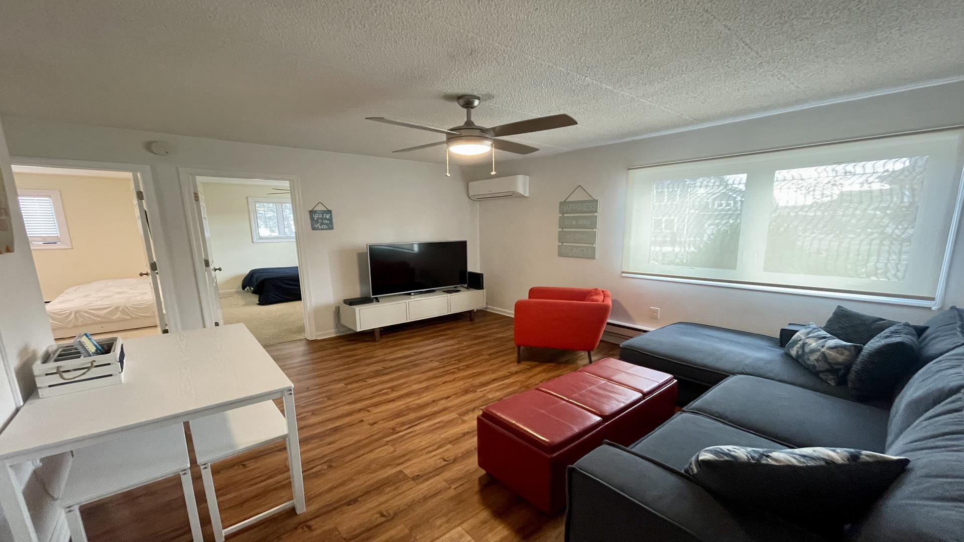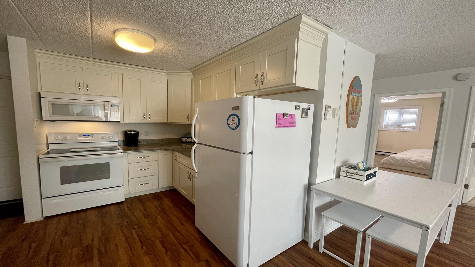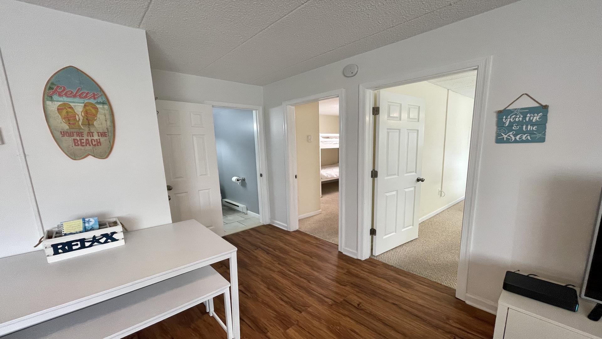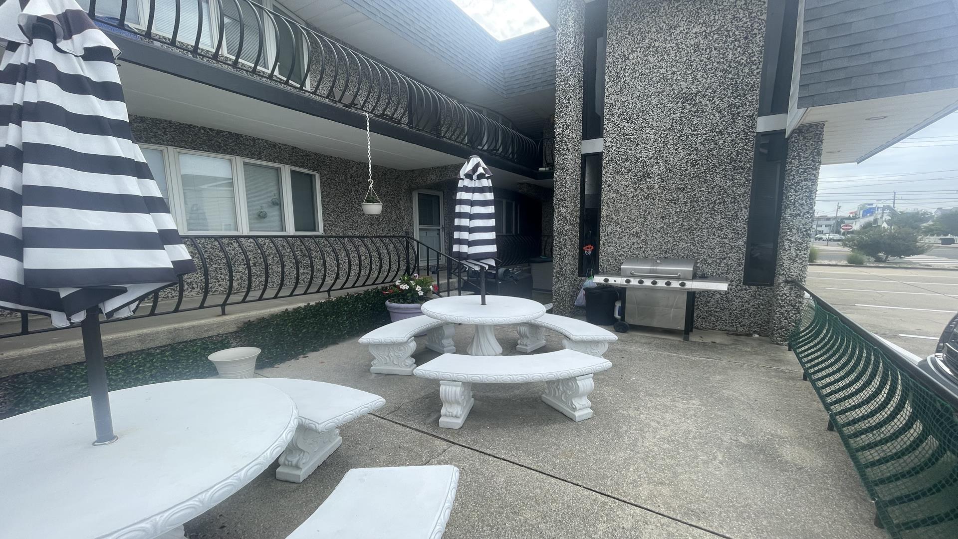 This 2/1 condo is very spacious and sleeps 6 people. It has a good sized kitchen area and a table for dining. Two Bedroom with a single bunk Bed and pull out single trundle bed. The other has a Queen Bed. Nice and Bright inside and one parking spot in front. The common patio has plenty of seating, bike storage and grills for outdoor dining! It is within walking distance to the beach, Duffers, Brittons Bakery and the Bike Path, Crest Pier, Playground and let's not forget the World Famous Boardwalk!