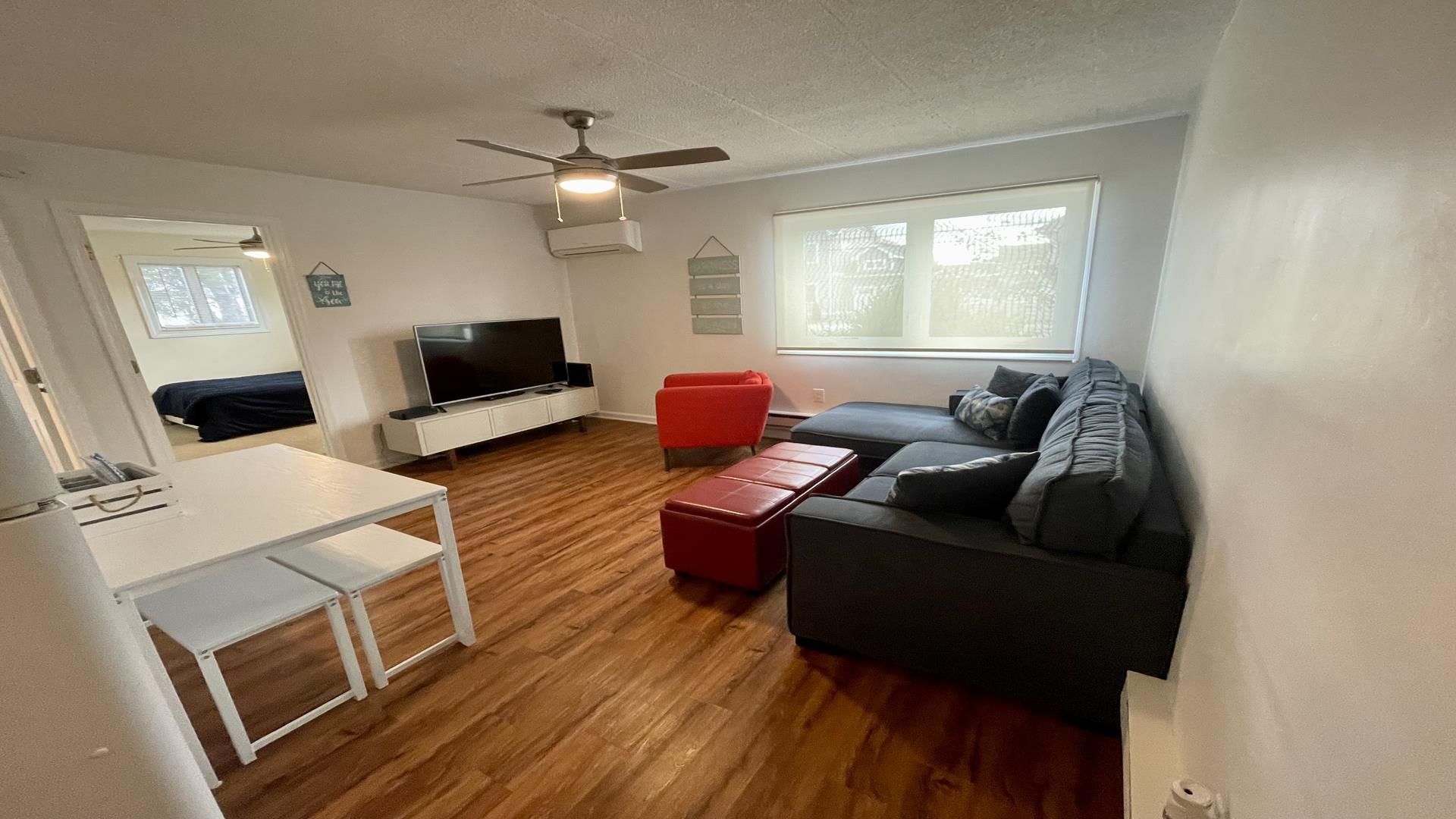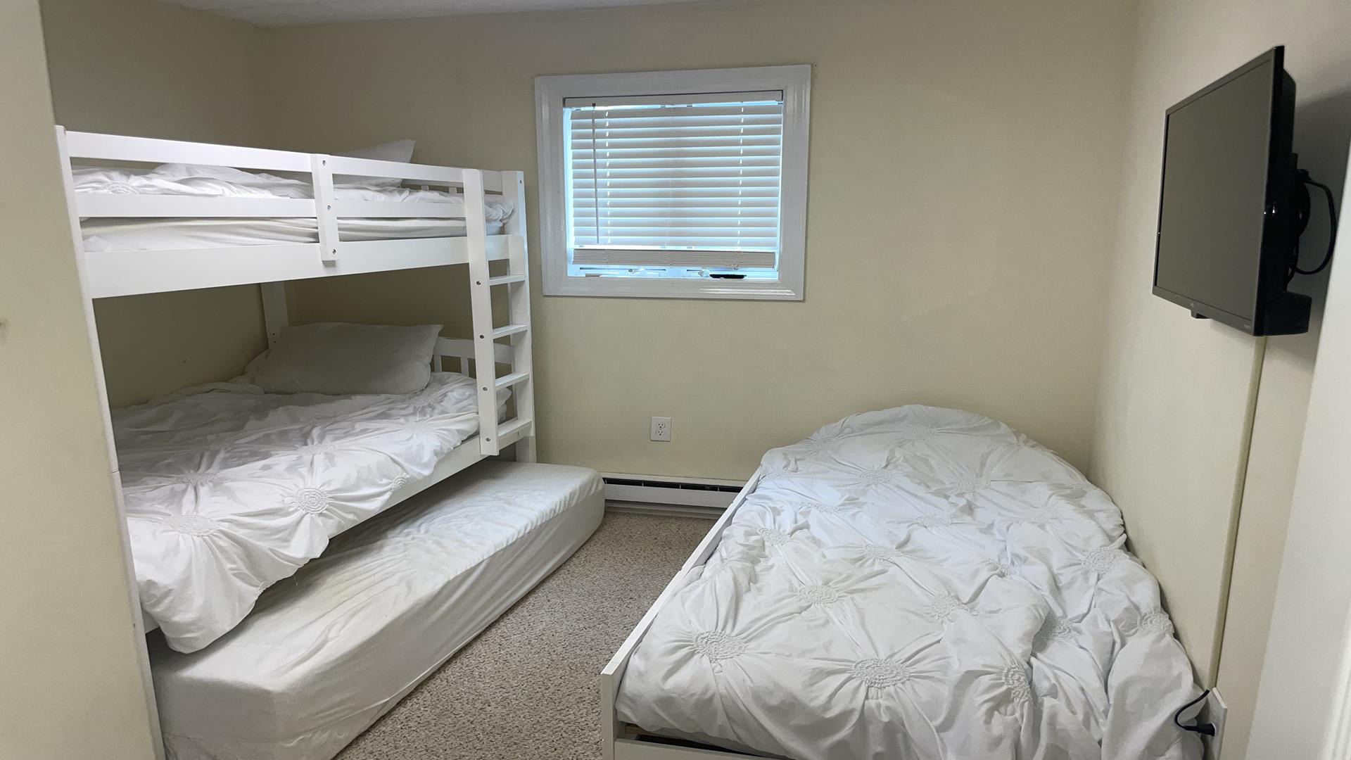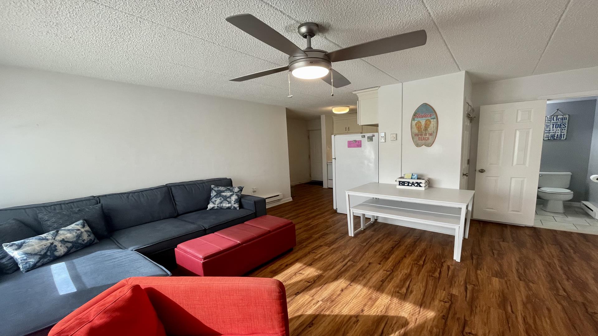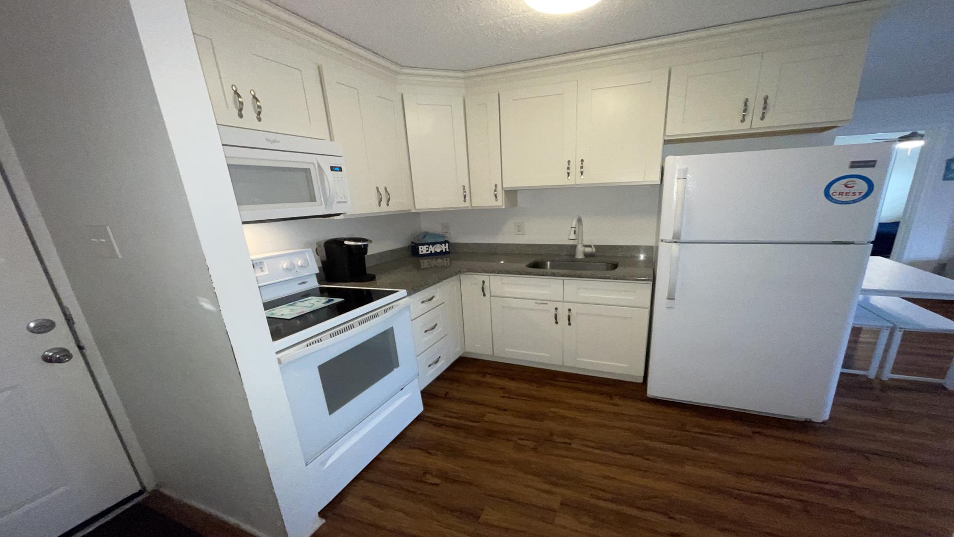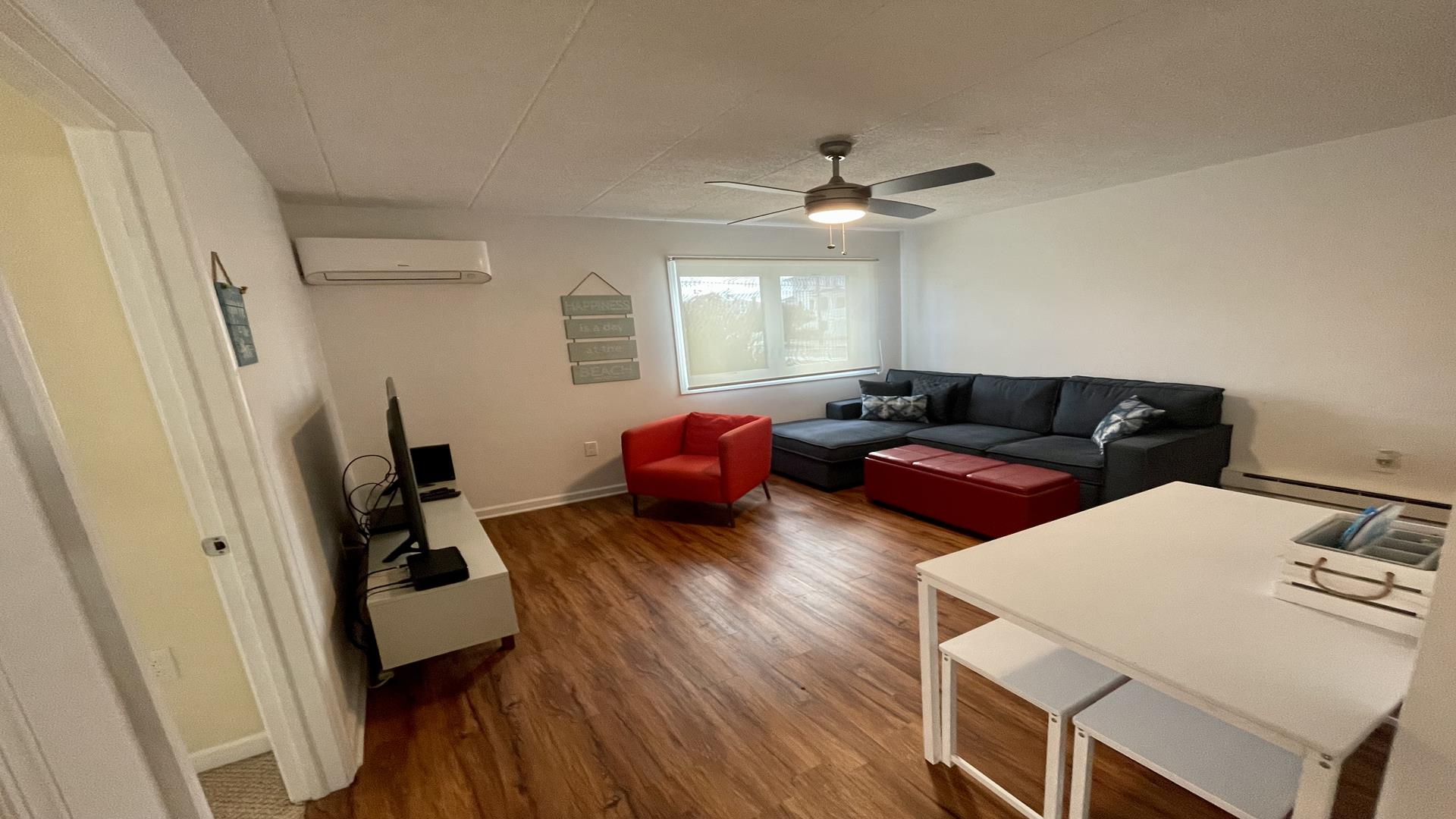 This 2/1 condo is very spacious and sleeps 6 people. It has a good sized kitchen area and a table for dining. Two Bedroom with a single bunk Bed and pull out single trundle bed. The other has a Queen Bed. Nice and Bright inside and one parking spot in front. The common patio has plenty of seating, bike storage and grills for outdoor dining! It is within walking distance to the beach, Duffers, Brittons Bakery and the Bike Path, Crest Pier, Playground and let's not forget the World Famous Boardwalk!